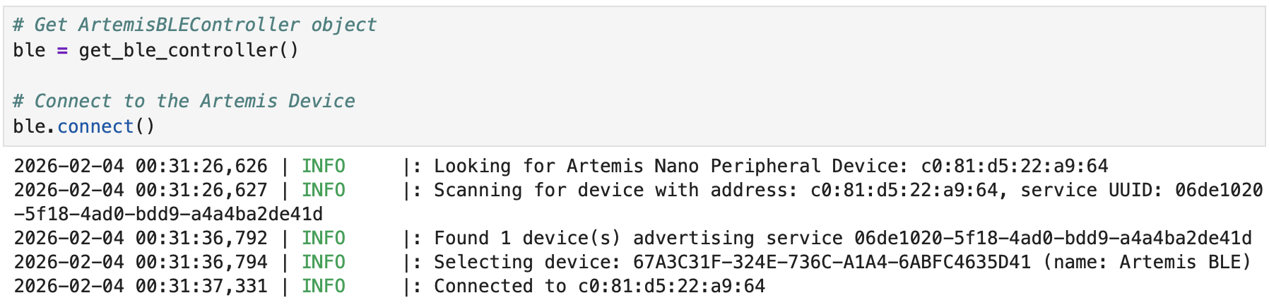 I generated the UUID in jupyter. I then updated the UUID in ble_arduino.ino and connections.yaml.
