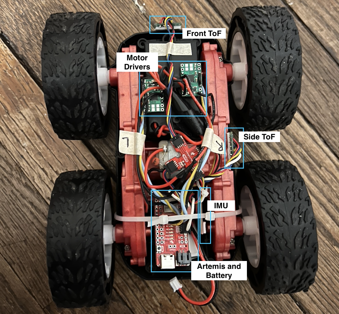 I removed the control PCB that came with the car and connected the motor and battery wires to my board. I then installed all the components including my TOF sensors and IMU in the car chassis. This allowed me to power the car with the 850mAh battery.