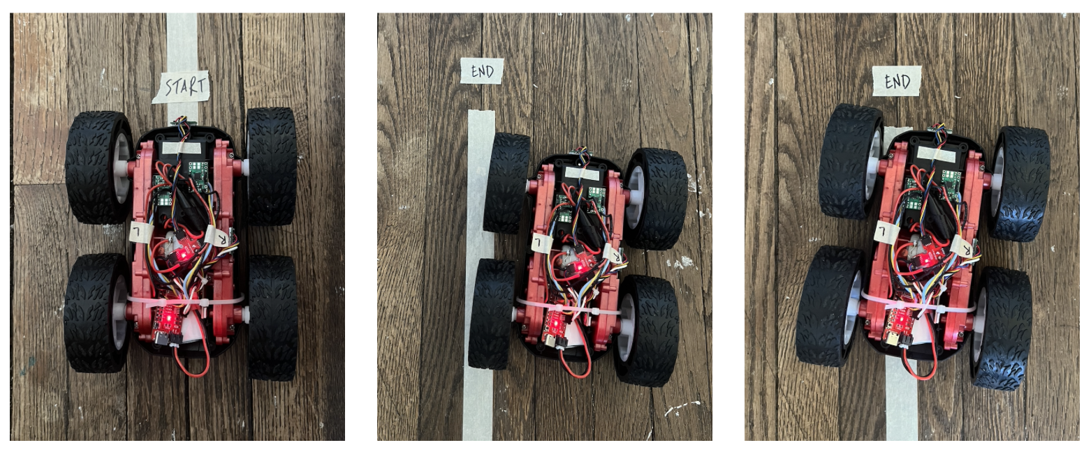Since my left wheel spun faster than my right wheel, I needed to implement a calibration factor in order to get the car to drive straight. I drove the car for about 7 feet to see how close it was. I noticed that the speed difference was greater at lower pwm values. The photo below shows the starting and ending position for PWM values of 50 and 100. There is more drift for 50. The calibration may require additional adjustments in the future depending on the car speed.