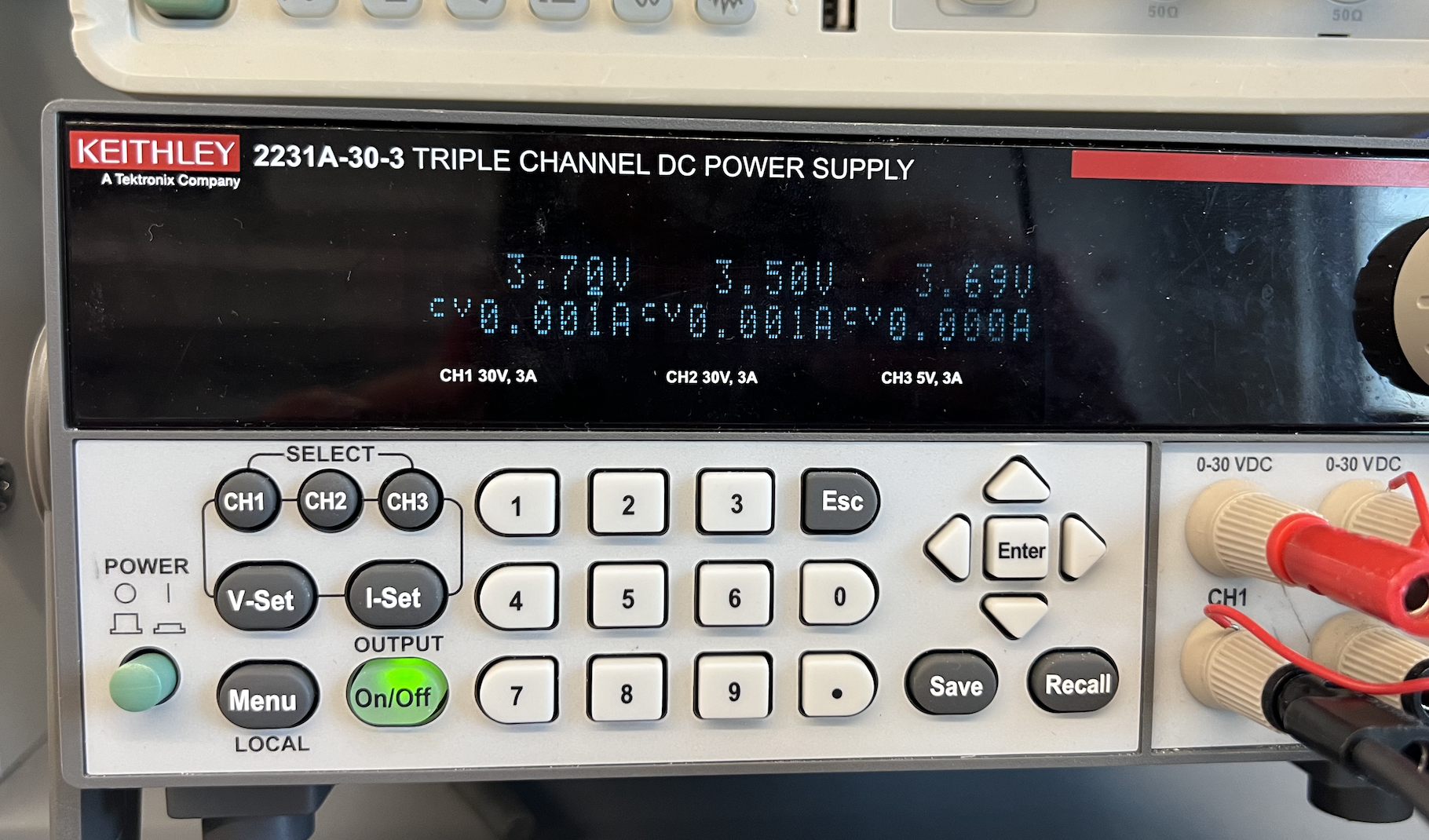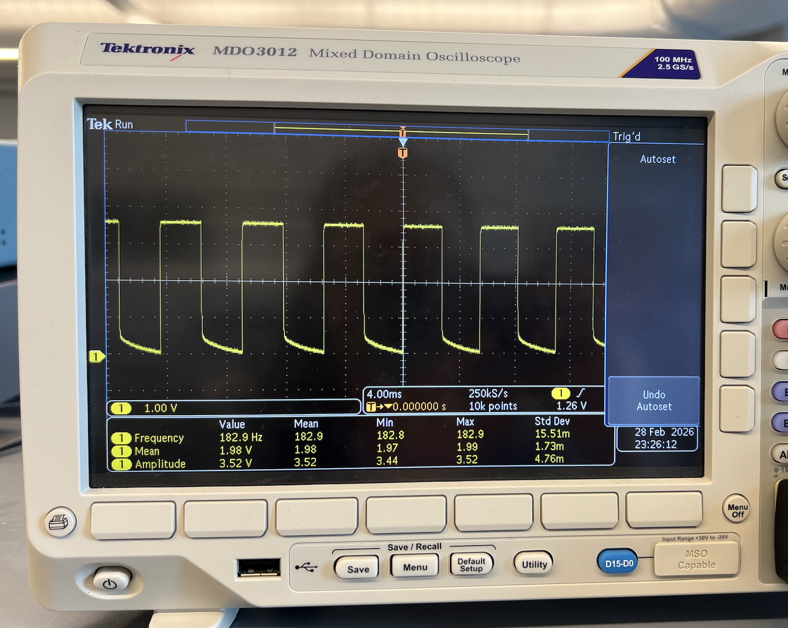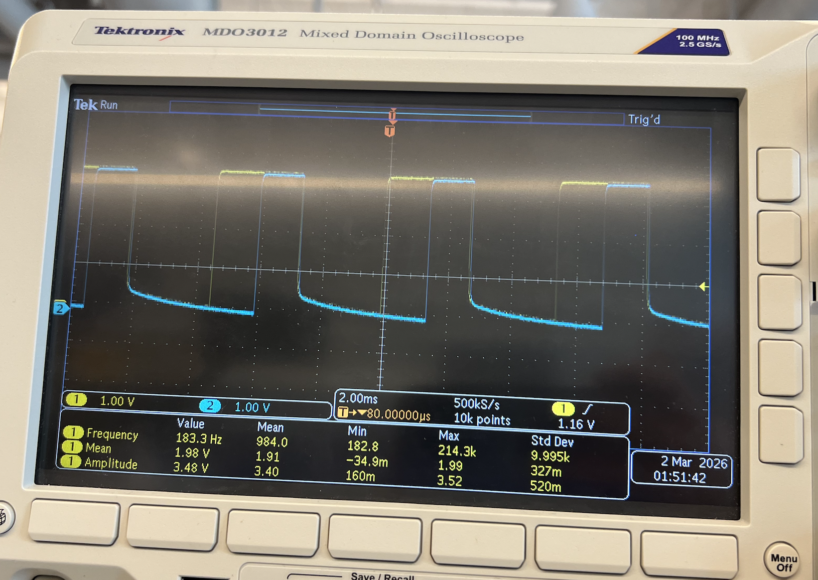 Before soldering the battery and motors to motor driver #1, I tested that it was able to receive PWM signals sent through the Artemis. I used an external DC power supply and an oscilloscope to read the signal output. I set the power supply voltage to 3.7V because this matches the battery that I will be using. It’s also in the range of what the motor driver accepts. I sent a PWM value of 128 which corresponds to a ~50% duty cycle which is reflected by my output reading. The voltage output is 3.7V as expected.