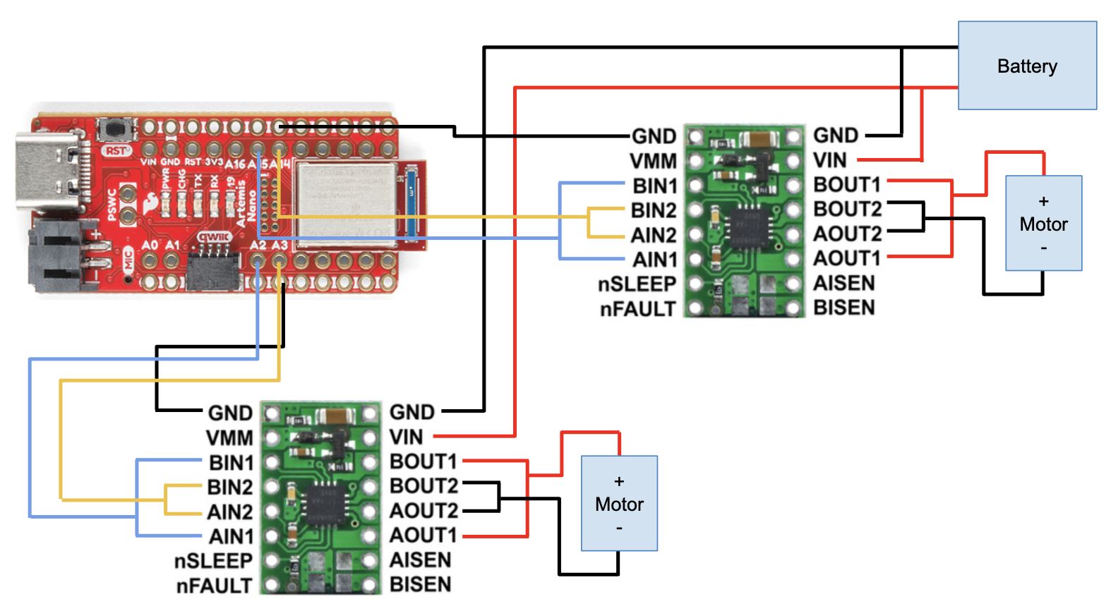 The Artemis and motor driver/motor are powered from separate batteries to avoid damaging the Artemis and reduce EMI. The motors can draw a lot of current, especially when starting up, which could cause the Artemis to malfunction or break.